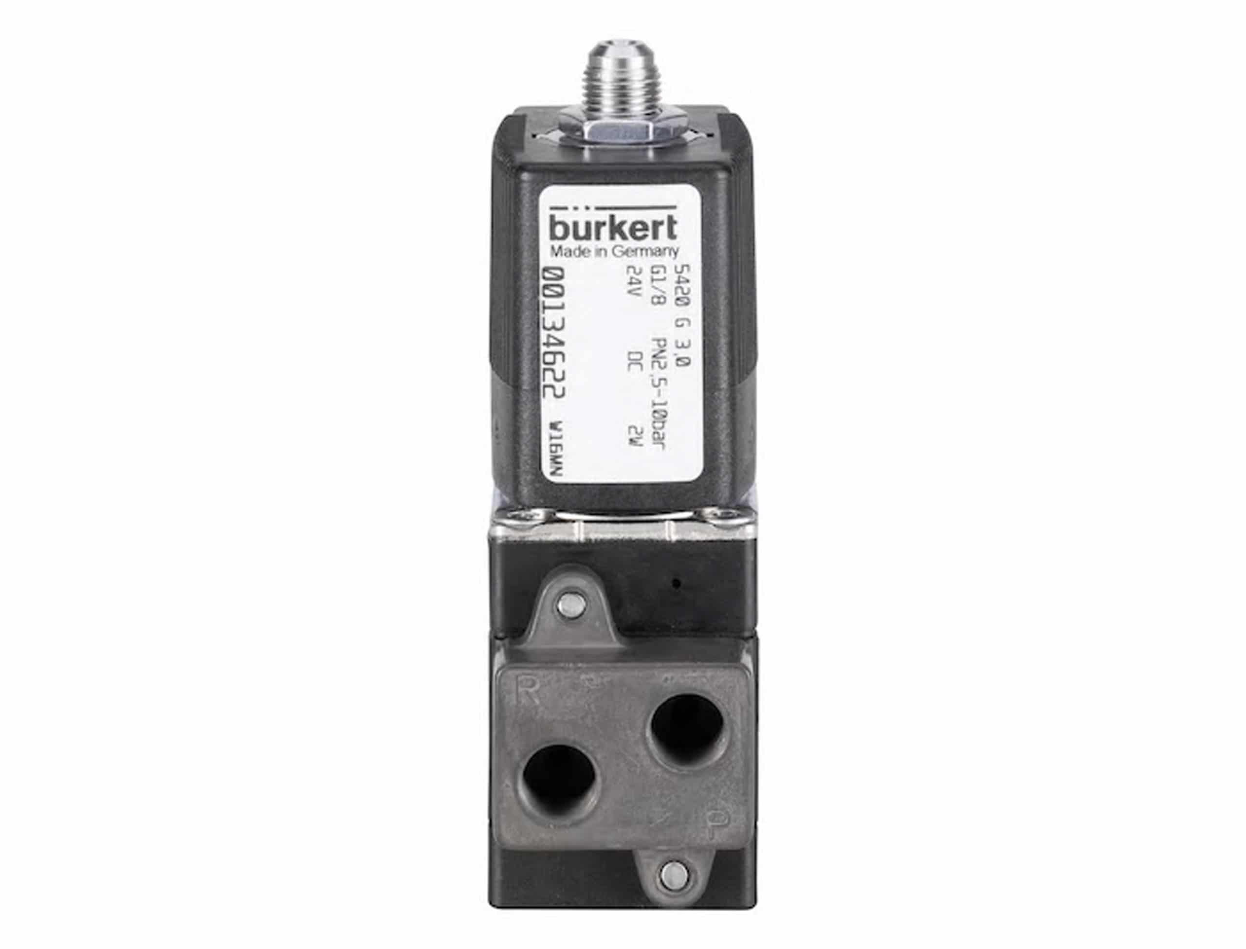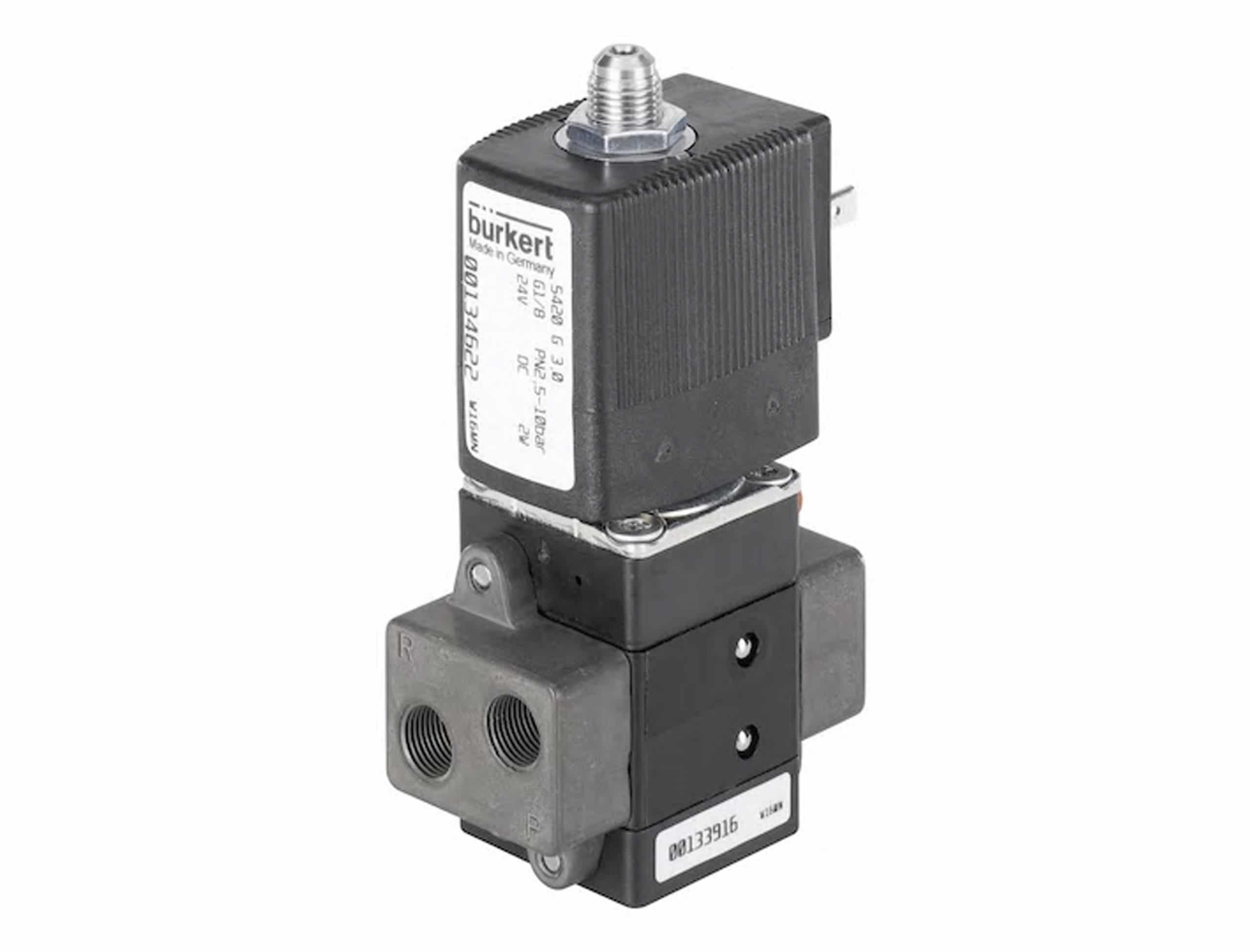 De Type 5420 magneetventiel van 230 Volt. Voor omschakeling is een minimaal drukverschil van 2,5 bar nodig. De klep kan worden gemonteerd op tweekanaals spruitstukken met een gemeenschappelijke druktoevoer.