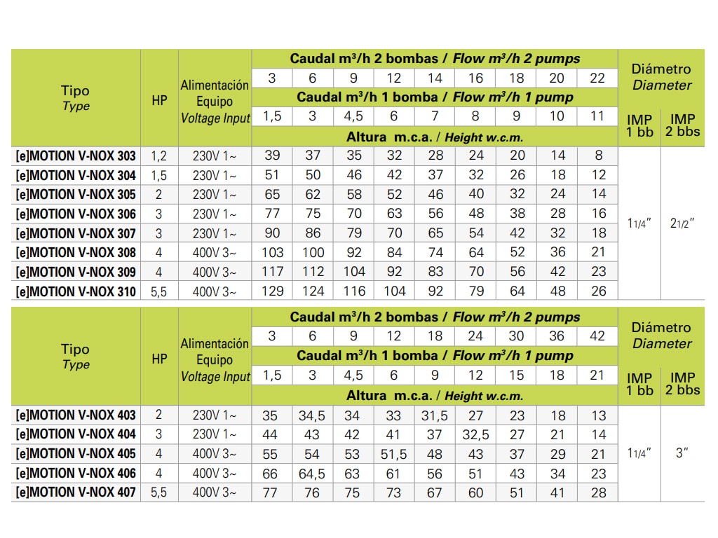 Het E-Motion-regelsysteem heeft een nieuwe frequentie omvormer die een vaste druk levert (het motortoerental van de pompen wordt verhoogd of verlaagd om de druk afhankelijk te houden van het benodigde debiet), energiebesparing en geruisloos werken. De installatie is heel eenvoudig, de gebruiker hoeft alleen maar de gewenste druk en de rotatie van de pompen te selecteren. Wanneer de werkdruk daalt als gevolg van waterverbruik, komen de pompen automatisch in werking. Naarmate de vraag toeneemt, verhoogt de E-Motion-eenheid de frequentie van de pompen om de gewenste druk te handhaven totdat de pompen hun maximale snelheid bereiken. De unit stopt automatisch als de werkdruk de door de gebruiker ingestelde waarde overschrijdt. Evenzo start de unit pas als de ingestelde startdruk is bereikt. Als er een tekort aan water in de toevoer is, zal de E-Motion dit onmiddellijk detecteren en de pompen stoppen om schade aan de unit te voorkomen. De V-Nox pomp-as, pomphuis en waaiers zijn gemaakt van roestvrij staal AISI 304, met diffusors in technopolymeer geïnjecteerd met glasvezel. Zuig- en aandrijfflenzen, zuigvoet en aandrijfhuis in gietijzer GG-20 met interne en externe roestwerende verf. De mechanische afdichting is grafietkeramiek en roestvrij staal AISI 304. De motor op de V-Nox is een standaard asynchrone motor, afgesloten van externe ventilatie en geschikt voor continu gebruik. De motor heeft beschermingsklasse IP 55 en isolatieklasse F.