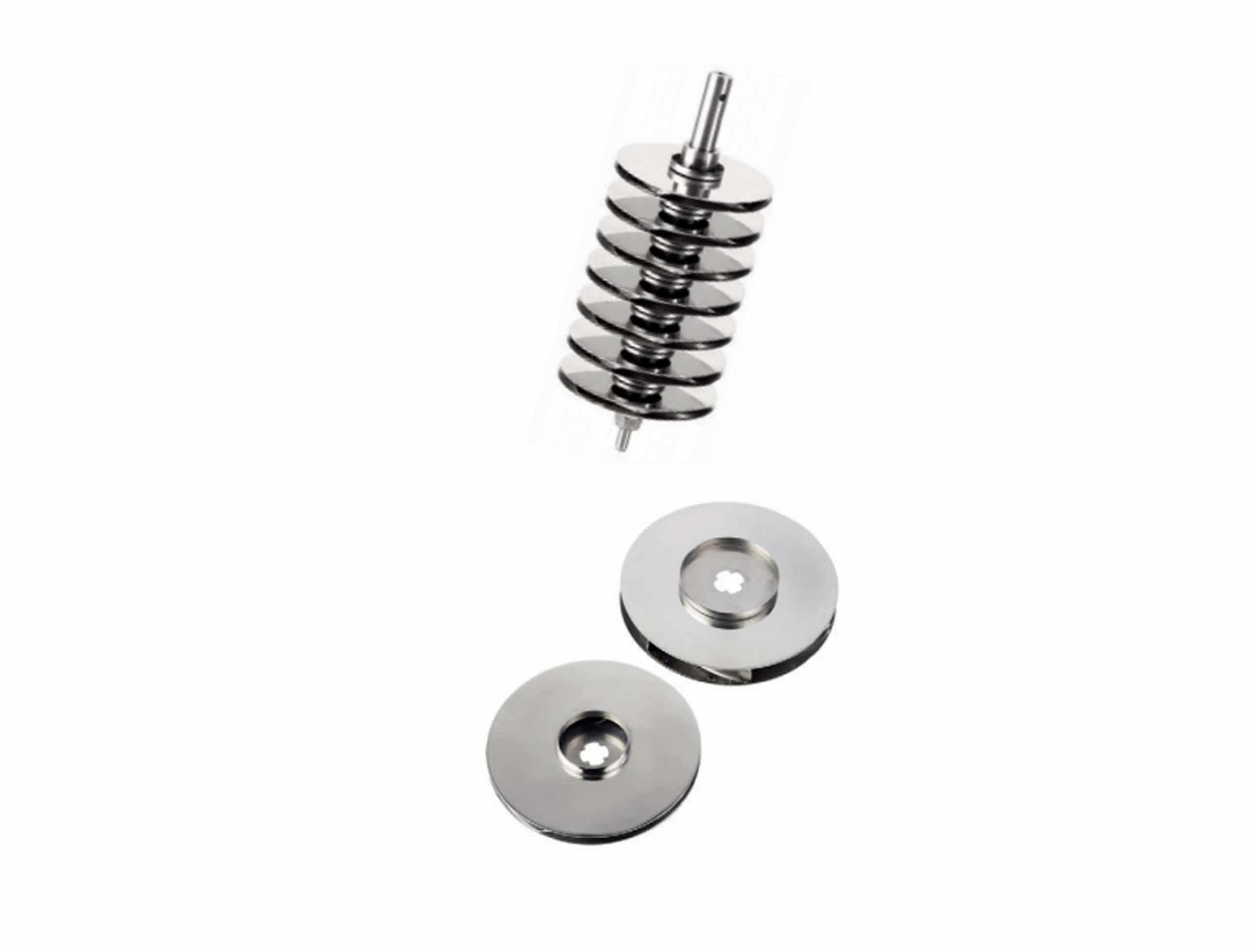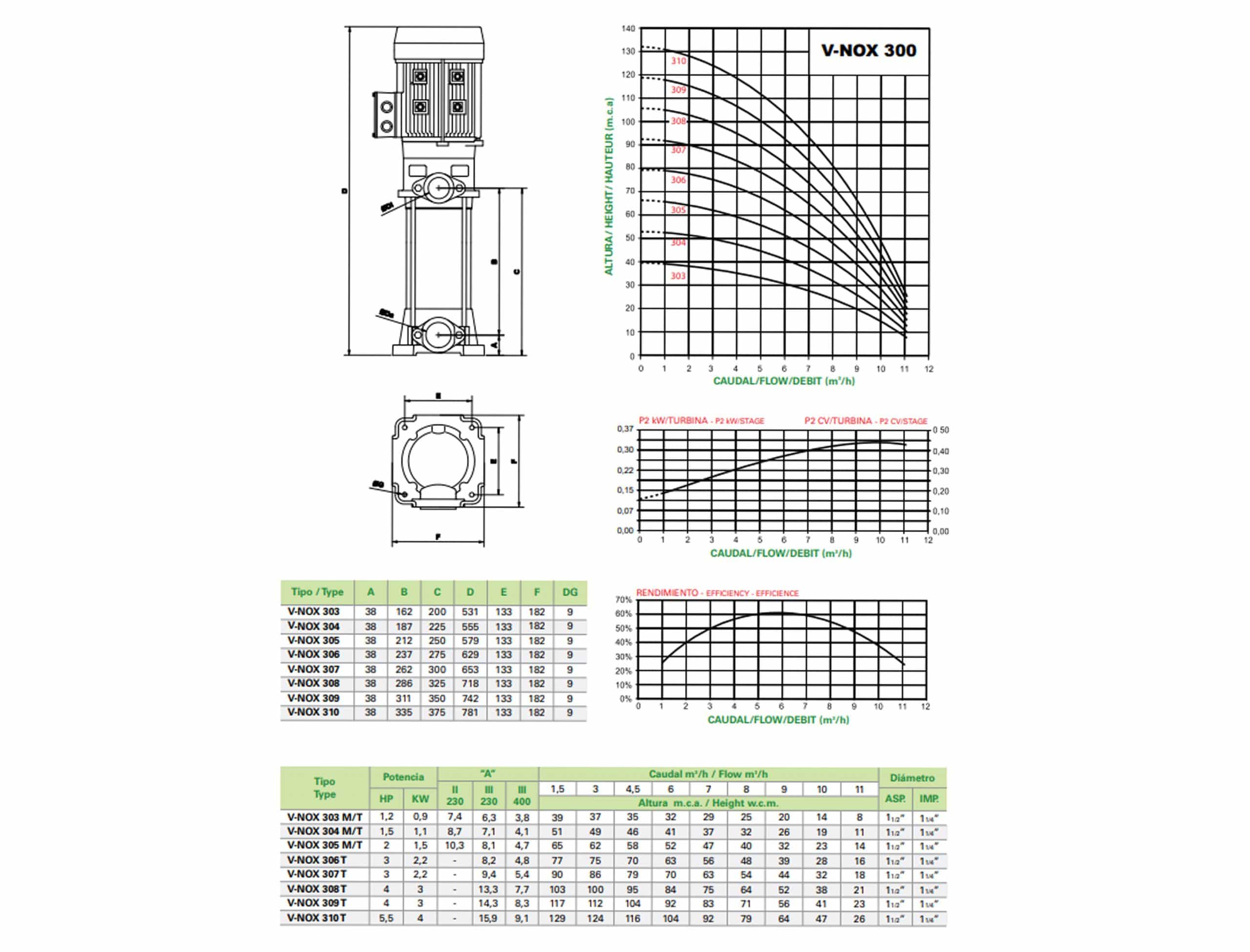 De waaier, pompas, pomphuis is in AISI 304 roestvrij staal. De zuig- en aandrijfflenzen, zuigvoet en aandrijfhuis in GG-20 gietijzer met binnen- en buitenzijde roestwerend. As ondersteund op onderste bus, geleiding in brons. Mechanische afdichting in grafiet en AISI 304.